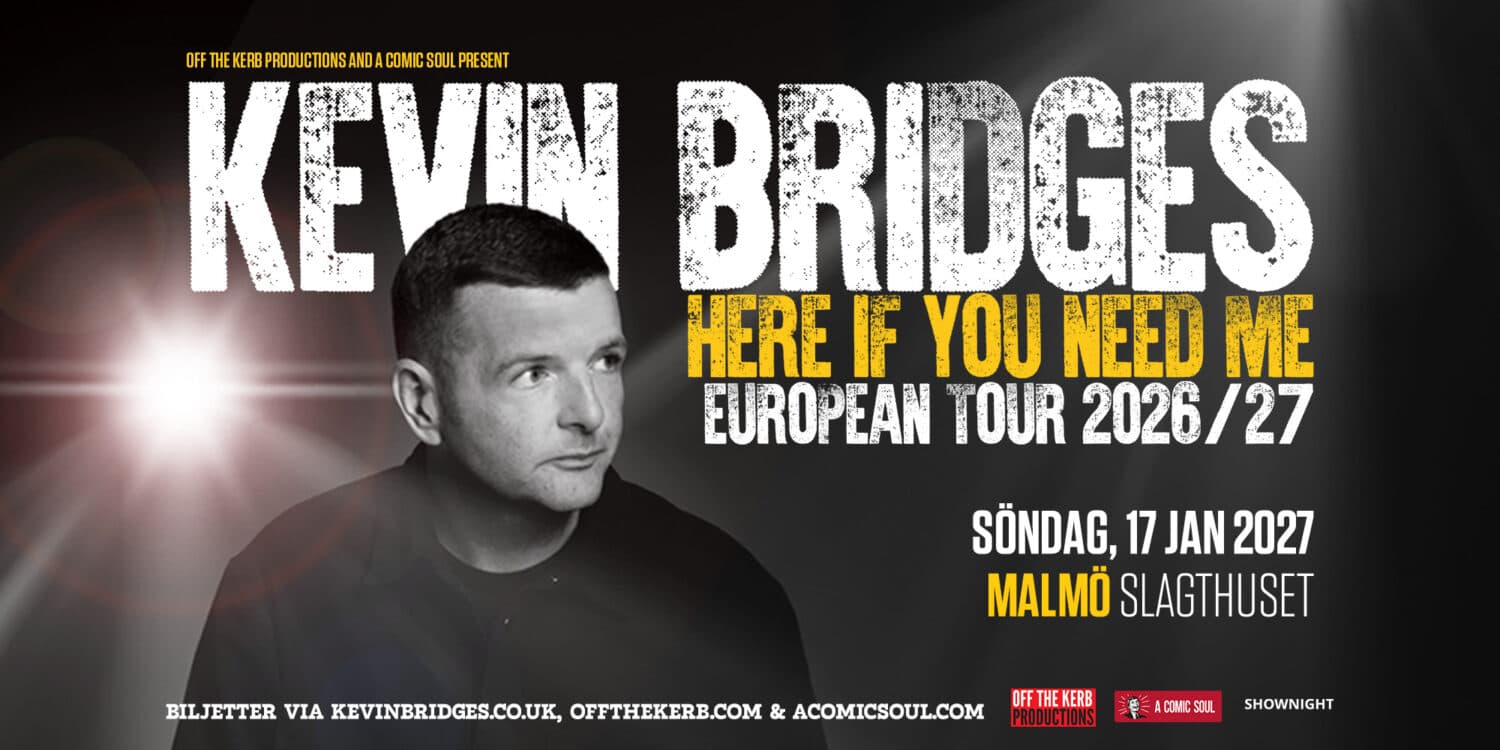 Den skotske standup-komikern Kevin Bridges kommer till Malmö med showen ”Here If You Need Me – European Tour 2026/27”. Den 17 januari intar han Slagthusets Teater! Sågs på Netflix. Sålde slut på Beacon Theatre i New York. Över två miljoner fans världen över. Kevin Bridges är en av de vassaste och mest originella rösterna inom ståuppkomik idag! Och han tar med sig sin helt nya show till Slagthuset. Orädd. Briljant rolig. Live. Nu i Malmö! Var inte den som missar honom. English: As seen on Netflix (13 år)